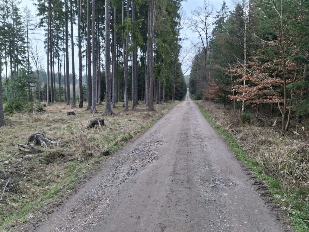 Procházím přes ves Sv. Kateřiny, což není úplně ves. Vypadá to tady jako kemp se závorou. Nejsem jistý, zda se tudy může chodit. Čekal jsem, že tady bude touto dobou klid. Nicméně tu vládne pracovní ruch tak pro jistotu hlasitě zdravím a mizím nahoru do lesa. Teď už se dostávám v podstatě do domácího rajonu. tudy jsem kdysi dokonce něco jako běhával (žádnej fofr to nikdy nebyl) jednu z delších tras. Dost často v noci a tenkrát zásadně bez čelovky. Nechápu, že jsem se přerazil jen párkrát nebo, že mě neskolil některý ze zdejších ostrostřelců v zelené kamizolce považující moje funění za zvuky agresivního raněného kance.