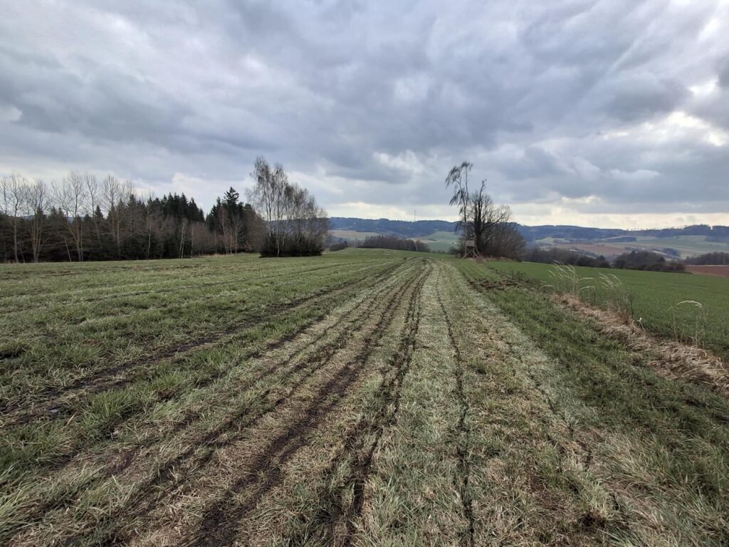 Nad Chotěvicemi to opět kazí pohnojená louka. Farmář mi nedal šanci a hnojil od kraje ke kraji. Tak jdu a romanticky kličkuji. Nikoliv však mezi kapkami deště ale mezi tmavými čůrky močůvky.