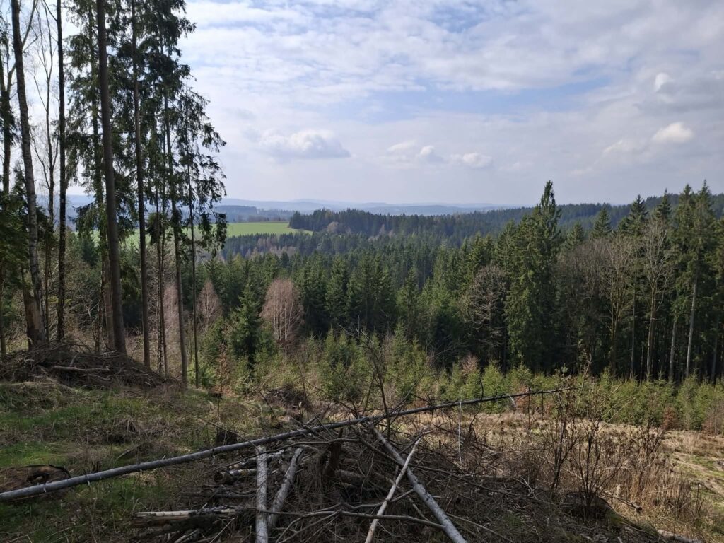 Vykácený les odhaluje daleké výhledy. Cíl trasy pod Zvičinou se odsud zdá povážlivě daleko.