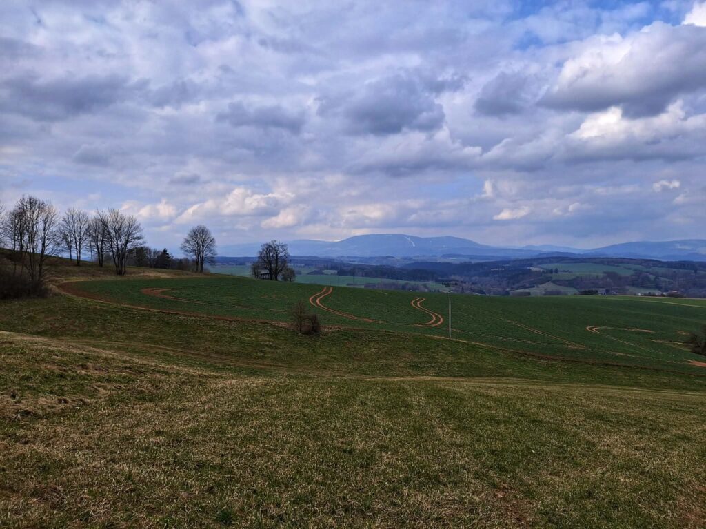 Když si tuhle procházku sesumíruju a podívám se na fotky, tak se mi povedl celkem unikát. Naplánovat trasu v Podkrkonoší, kde během 30 km jsou hory vidět jen z jednoho místa. Většinu cesty jsem měl možnost vidět jen kousek masivu Černé Hory.